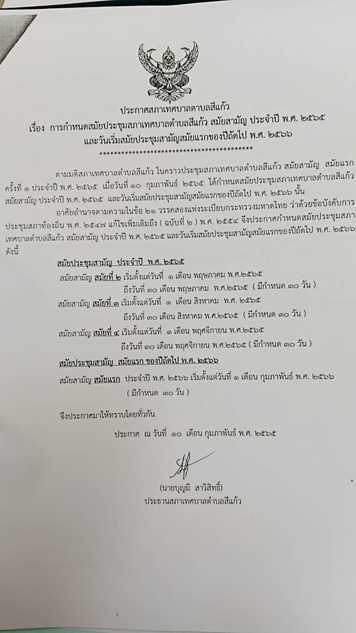 ประกาศสภาเทศบาลตำบลสีแก้วการกำหนดสมัยประชุม สมัยสามัญ ประจำปี พ.ศ 2565และสมัยสามัญ สมัยแรกของปีถัดไป พ.ศ 2566