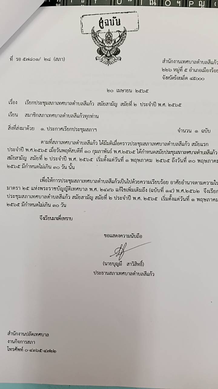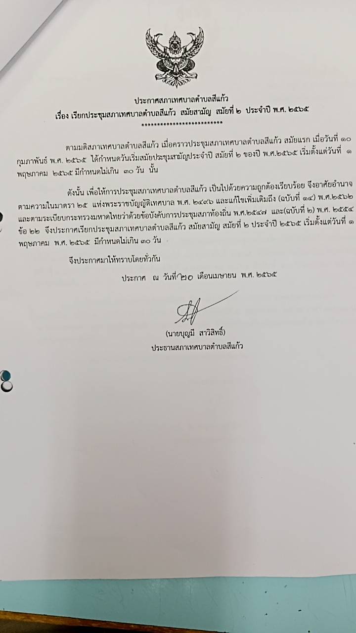 หนังสือส่งเรียกประชุมสภาเทศบาลตำบลสีแก้ว สมัยสามัญ สมัยที่ 2 ประจำปี พ.ศ. 2565