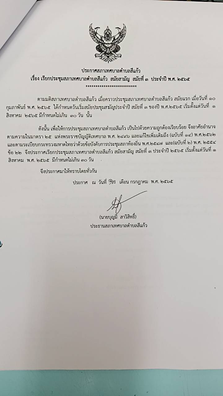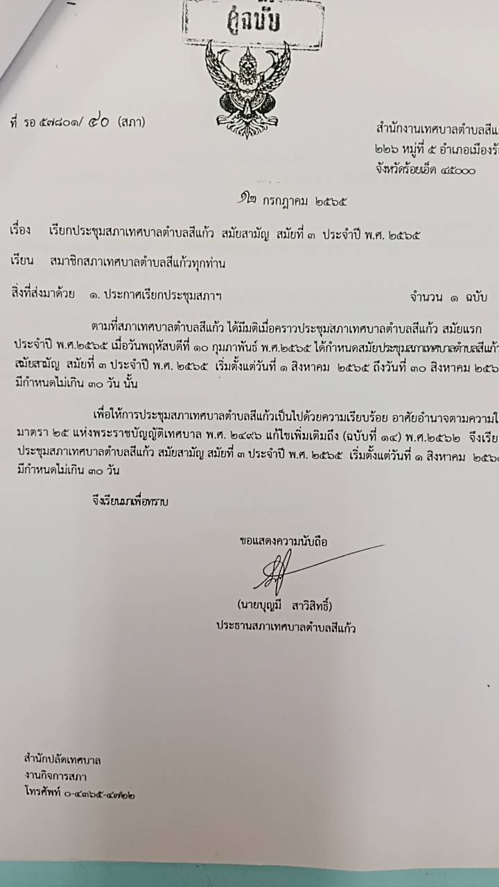 หนังสือส่งเรียกประชุมสภาเทศบาลตำบลสีแก้ว สมัยสามัญ สมัยที่ 3 ประจำปี พ.ศ. 2565