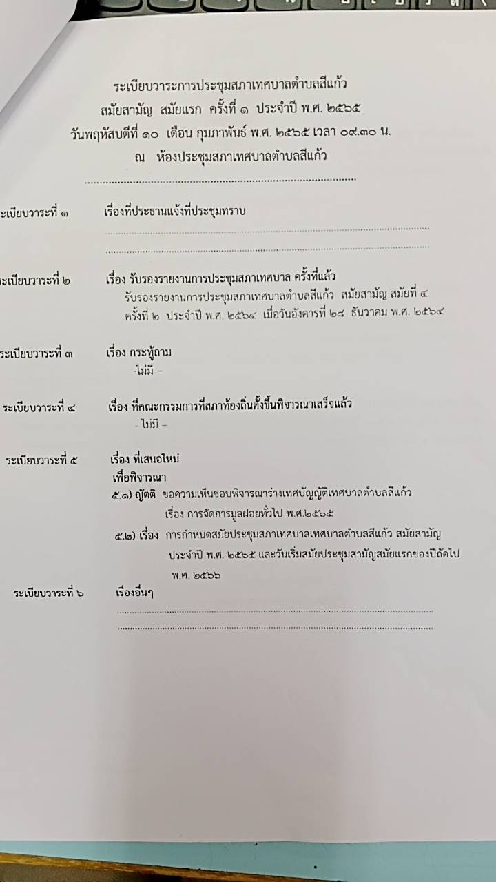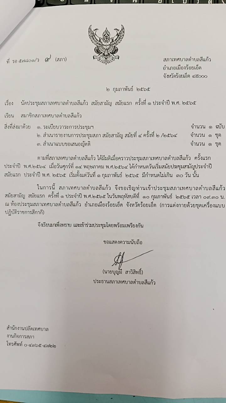 หนังสือนัดประชุมสภาเทศบาลตำบลสัแก้ว สมัยสามัญ สมัยแรก ครั้งที่ 1 ประจำปี พ.ศ. 2565