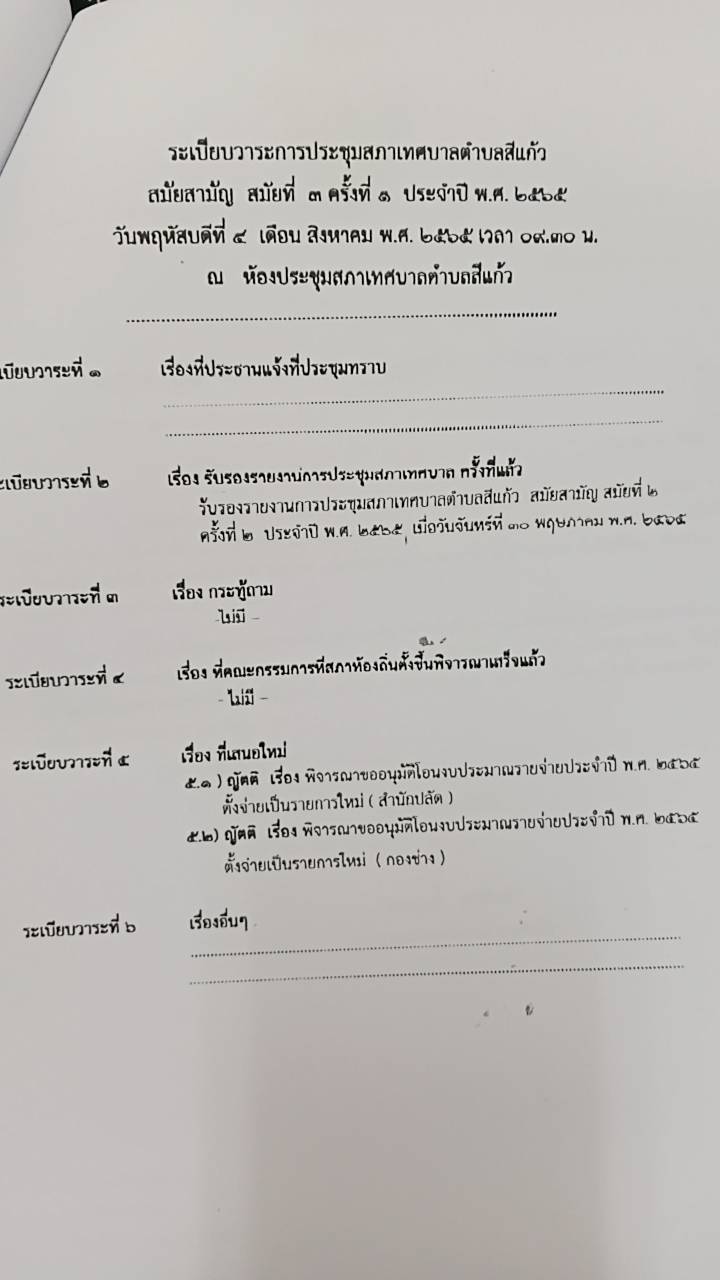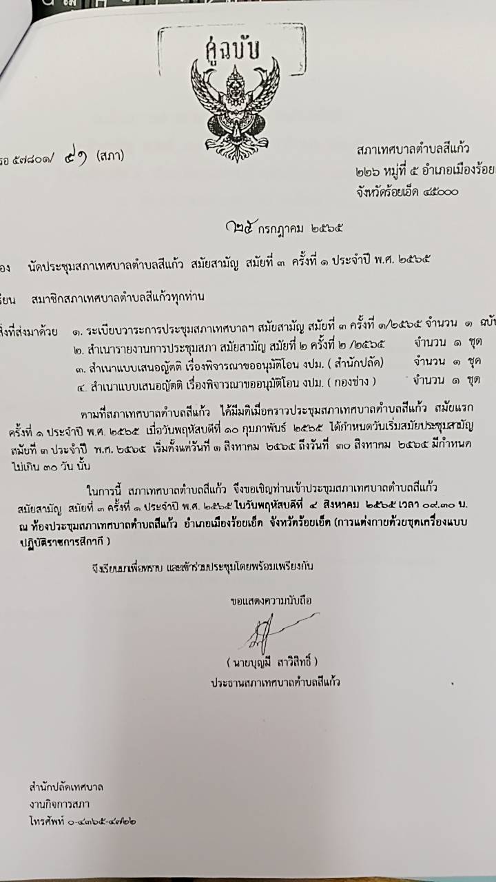 หนังสือนัดประชุมสภาเทศบาลตำบลสัแก้ว สมัยสามัญ สมัยที่ 3 ครั้งที่ 1 ประจำปี พ.ศ. 2565