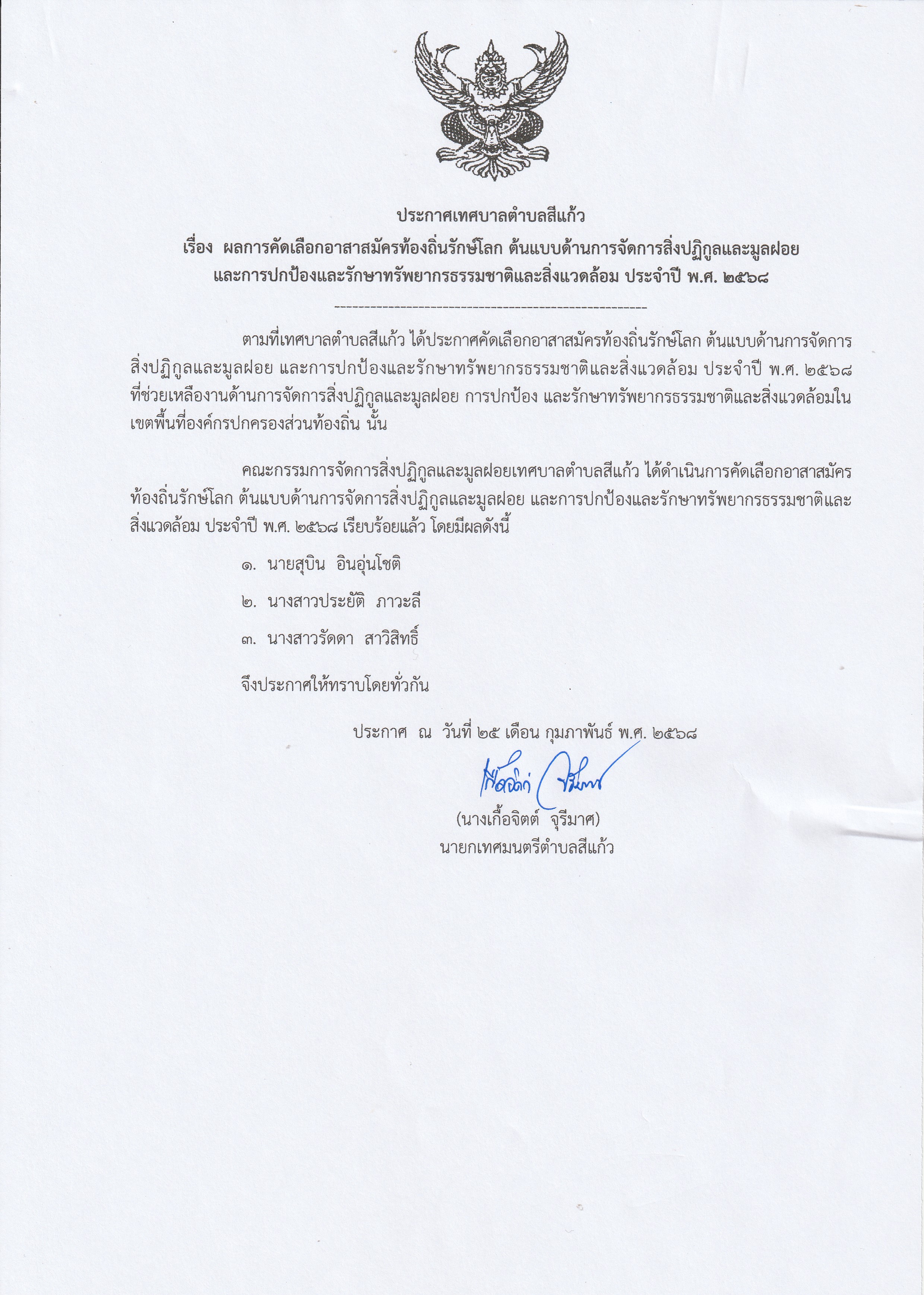 ชื่อเรื่อง : ประกาศเทศบาลตำบลสีแก้ว เรื่อง ผลการคัดเลือกอาสาสมัครท้องถิ่นรักษ์โลก ต้นแบบด้านการจัดการสิ่งปฏิกูลและมูลฝอย และการปกป้องและรักษาทรัพยากรธรรมชาติและสิ่งแวดล้อม ประจำปี พ.ศ. 2568